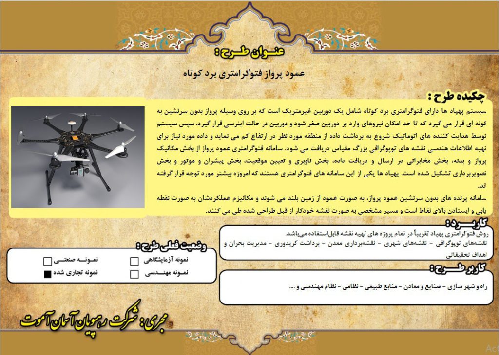 حوزه: پهپاد و رباتیک کاربرد: فتوگرامتری و نقشه برداری ظرفیت تولید سالانه : 50 دستگاه محل اجرای طرح: دانشگاه رازی دانشکده فنی و مهندسی |